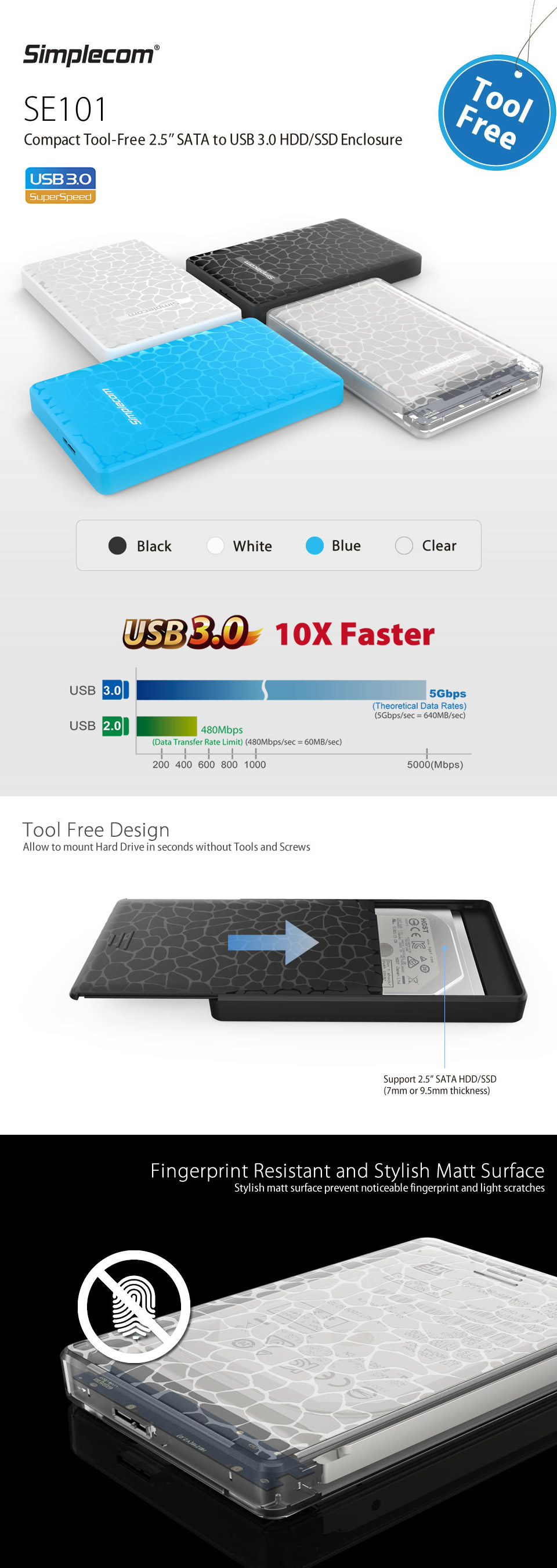 The Simplecom SE101 USB 3.0 Enclosure is a lightweight and simple 2.5in SATA to USB 3.0 HDD/SSD Enclosure. It is a bus-powered portable hard drive enclosure that provides fast USB 3.0 transfer speeds, supports hot-swap, plug and play and features a handy LED light which indicates both Power and Activity status. SE101 features a stylish and ultra compact design, compatible with 7mm or 9.5mm SATA 2.5in drives.