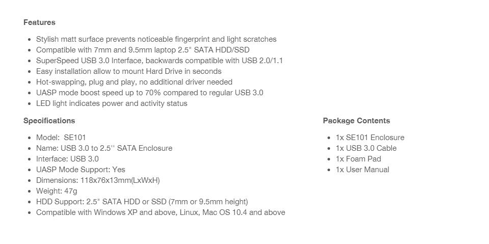 The Simplecom SE101 USB 3.0 Enclosure is a lightweight and simple 2.5in SATA to USB 3.0 HDD/SSD Enclosure. It is a bus-powered portable hard drive enclosure that provides fast USB 3.0 transfer speeds, supports hot-swap, plug and play and features a handy LED light which indicates both Power and Activity status. SE101 features a stylish and ultra compact design, compatible with 7mm or 9.5mm SATA 2.5in drives.