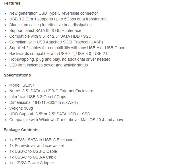 Sold Out - Check back or email us for updatesSE331 is a stylish and well-crafted SATA to USB-C aluminium enclosure for 3.5'' or 2.5'' SATA hard drive or solid state drive. It comes with reversible USB-C port, and supports data transfer rate up to 5Gbps via USB 3.2 Gen1 interface. With a solid aluminium casing, it looks elegant and professional on the desk, also for effective heat dissipation. Easy installation design allows to mount SATA drive in seconds, plug and play, and no driver software required. A LED light helps to monitor the working status of SATA drive. It’s an ideal storage solution for data transfer, backup, and more.