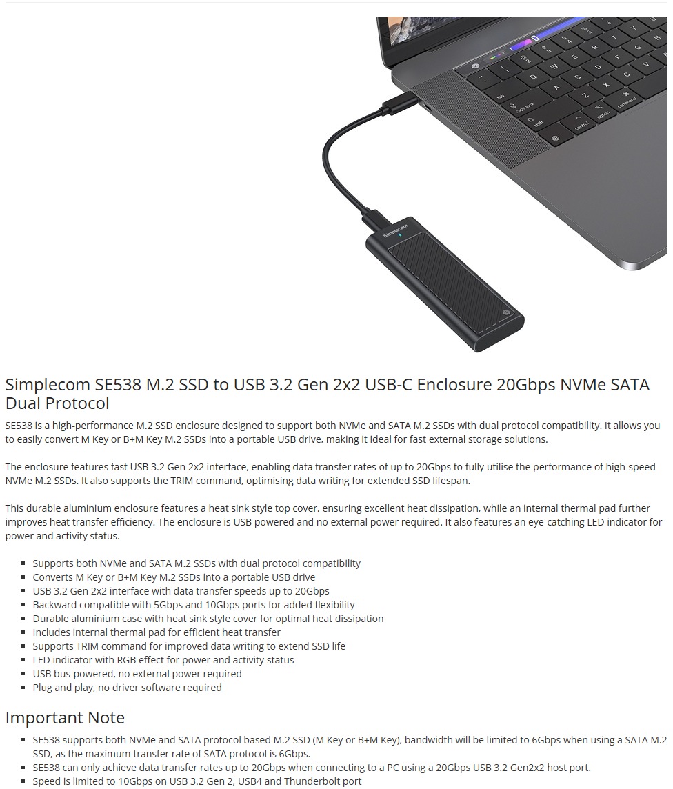 The Simplecom SE538 is a high-speed M.2 SSD enclosure designed for both NVMe and SATA drives, offering dual protocol compatibility via a USB 3.2 Gen 2x2 USB-C interface. It delivers blazing-fast data transfer rates up to 20Gbps for NVMe SSDs, housed in a sleek aluminum casing with a heat sink-style cover and internal thermal pad for efficient cooling.