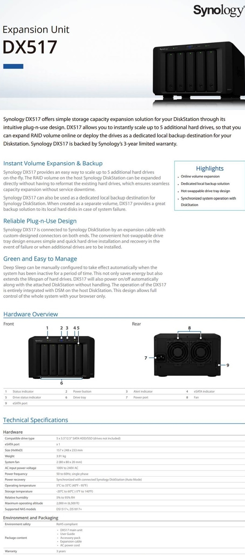 The Synology DX517 5 Bay Diskless Expansion Unit is built to support on-the-fly volume expansion and local backups, the DX517 5-Bay Expansion Enclosure from Synology adds an additional five 3.5"/2.5" SATA drive bays to their DiskStation DS1517+ 5-Bay NAS Enclosure or DiskStation DS1817+ 8-Bay NAS Enclosure and DS1618+ ,DS918+, DS718+, DS1817 , DS1517, NVR1218. Its drive bays are hot-swappable and screwless, and included is an AC power cord, an accessory pack, and an eSATA expansion cable. With a 3 year Synology warranty.