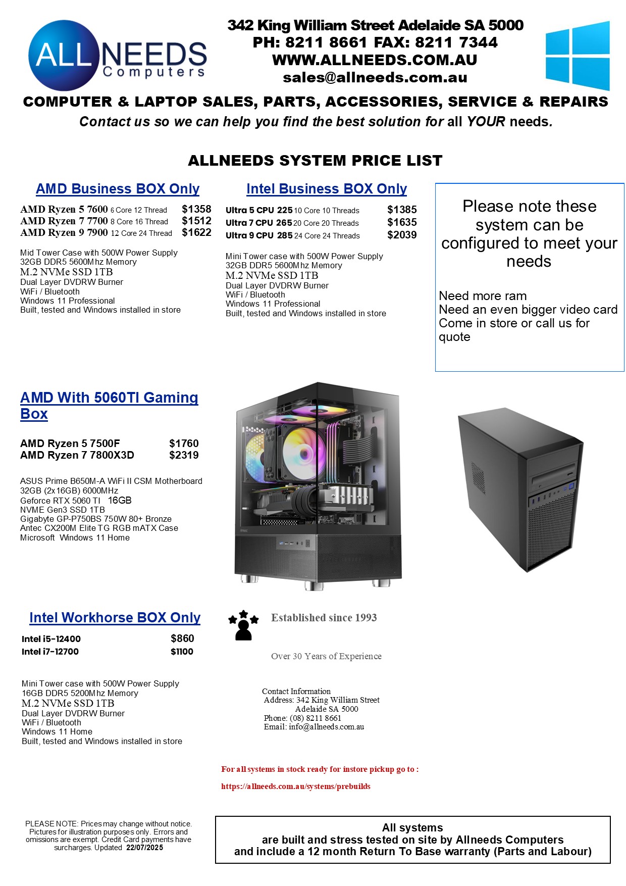 Systems from Allneeds Computers are built, stress tested and include a 12 month return to base warranty (parts and labour), plus the FULL manufacturer’s warranty on all parts.