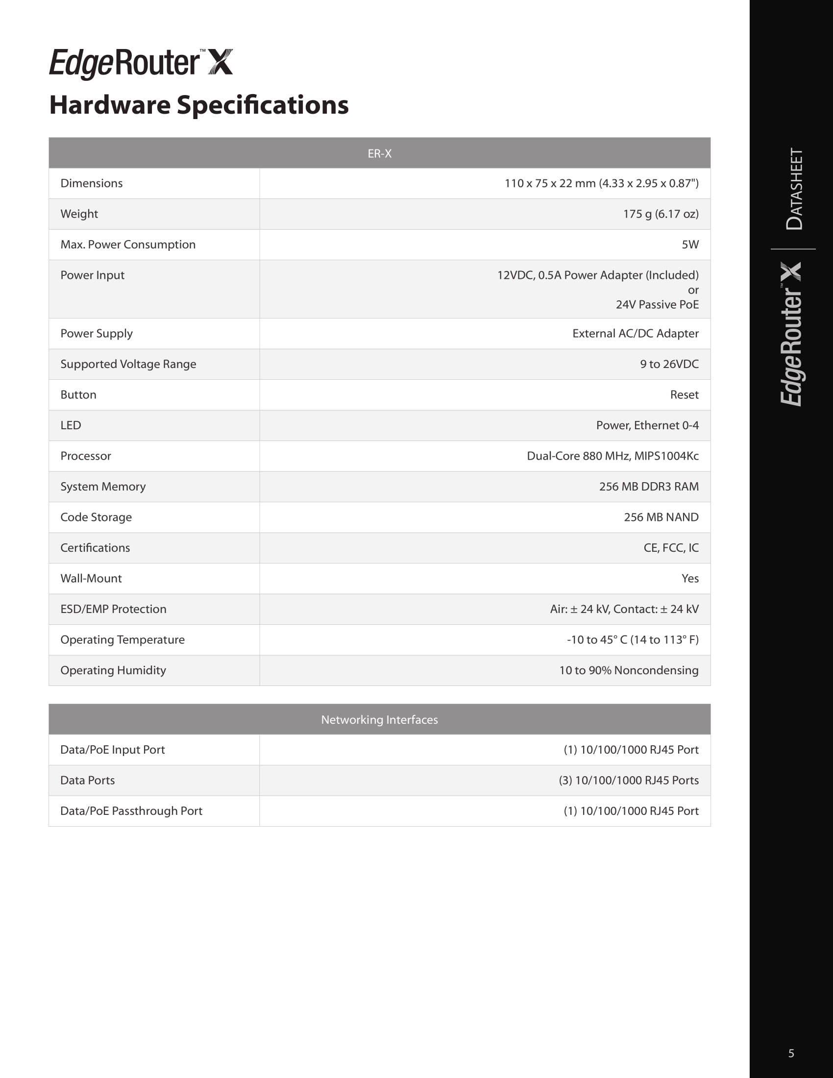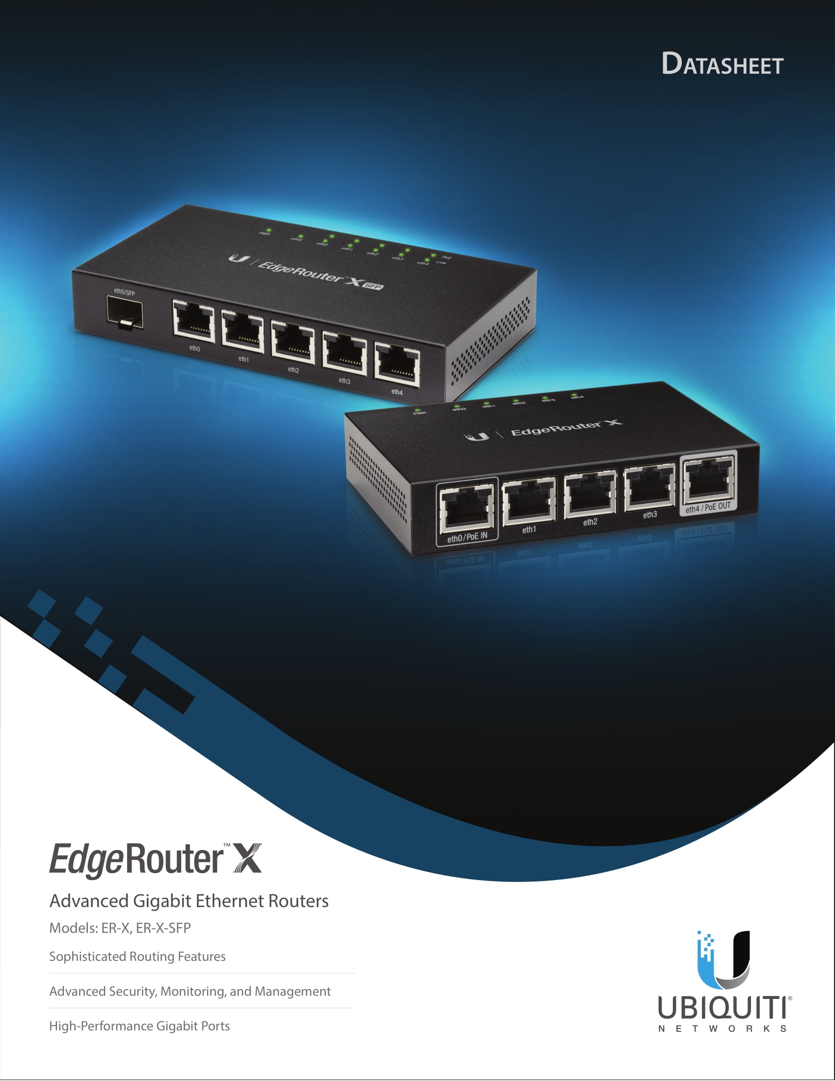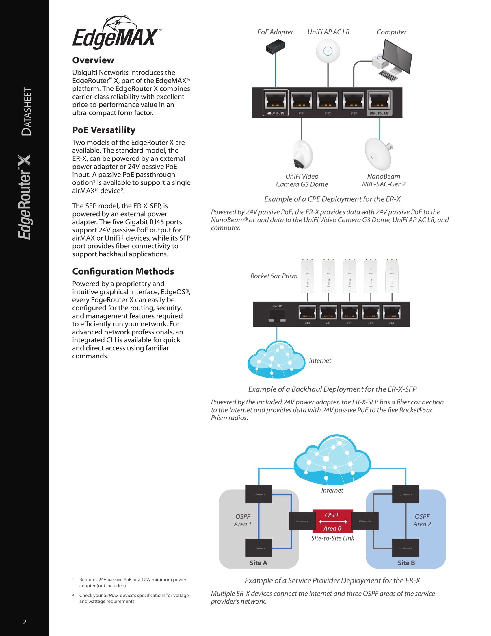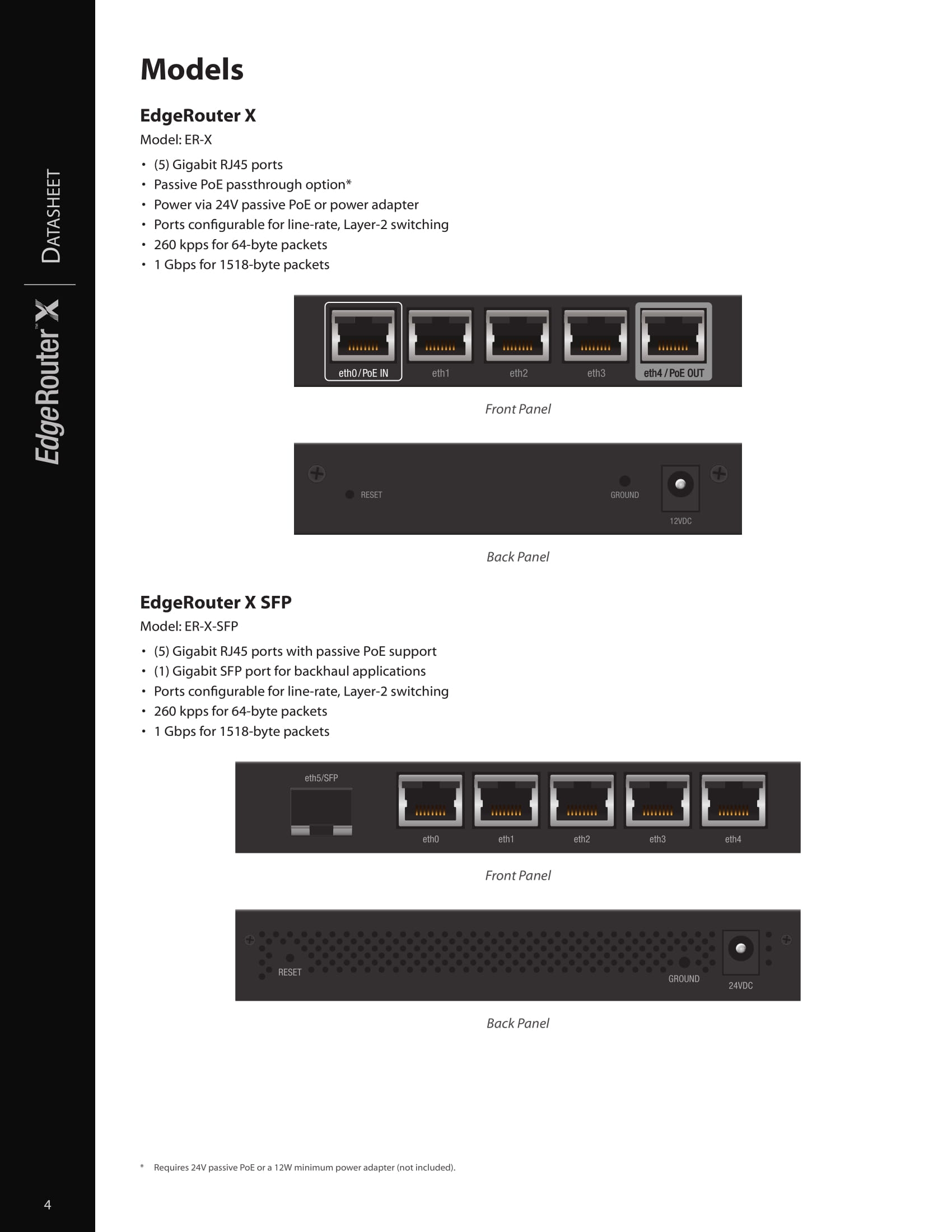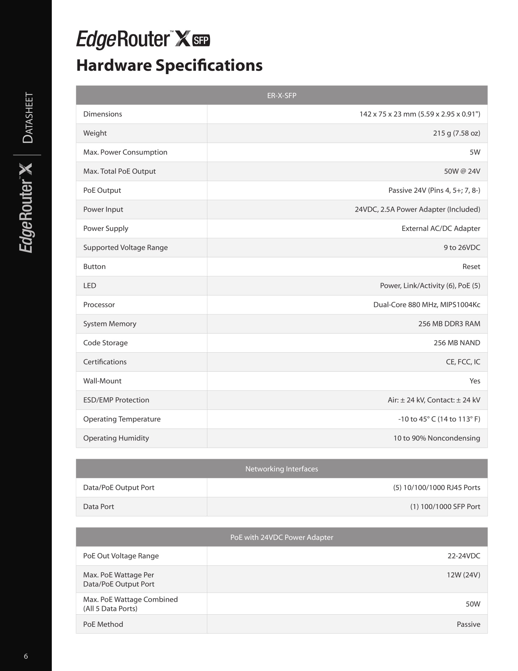The Ubiquiti EdgeRouter™ X SFP features five independent, Gigabit RJ45 ports and one Gigabit SFP port – all six are configurable for switching., powered by 24V passive PoE or a power adapter, the EdgeRouter™X features a passive PoE passthrough option to power an airMAX®device.