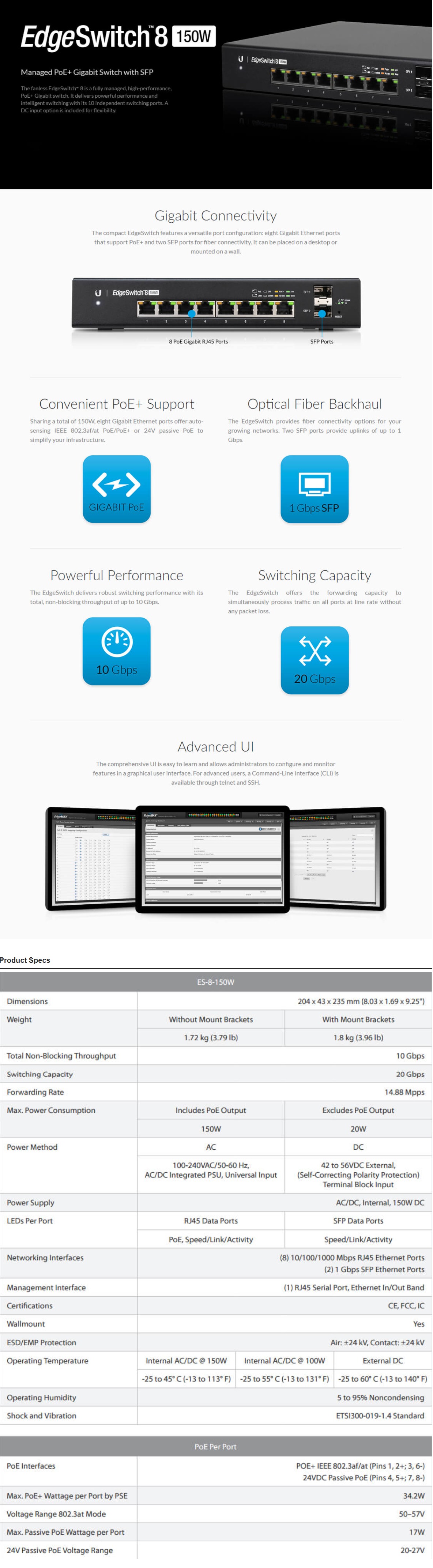 Sold Out - Check back or email us for updatesThe fanless EdgeSwitch 8 is a fully managed, high-performance, PoE+ Gigabit switch. It delivers powerful performance and intelligent switching with its 10 independent switching ports. A DC input option is included for flexibility.