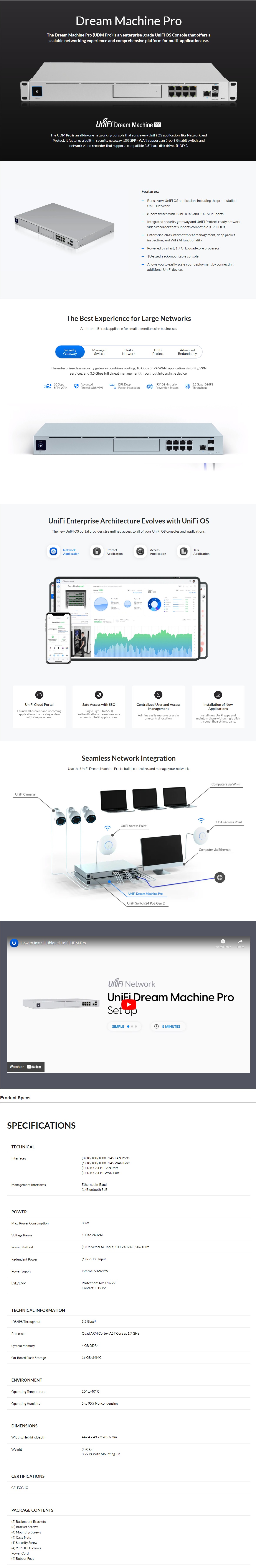 Sold Out - Check back or email us for updatesThe UDM Pro is an all-in-one networking console that runs every UniFi OS application, like Network and Protect. It features a built-in security gateway, 10G SFP+ WAN support, an 8-port Gigabit switch, and network video recorder that supports compatible 3.5" hard disk drives (HDDs).
