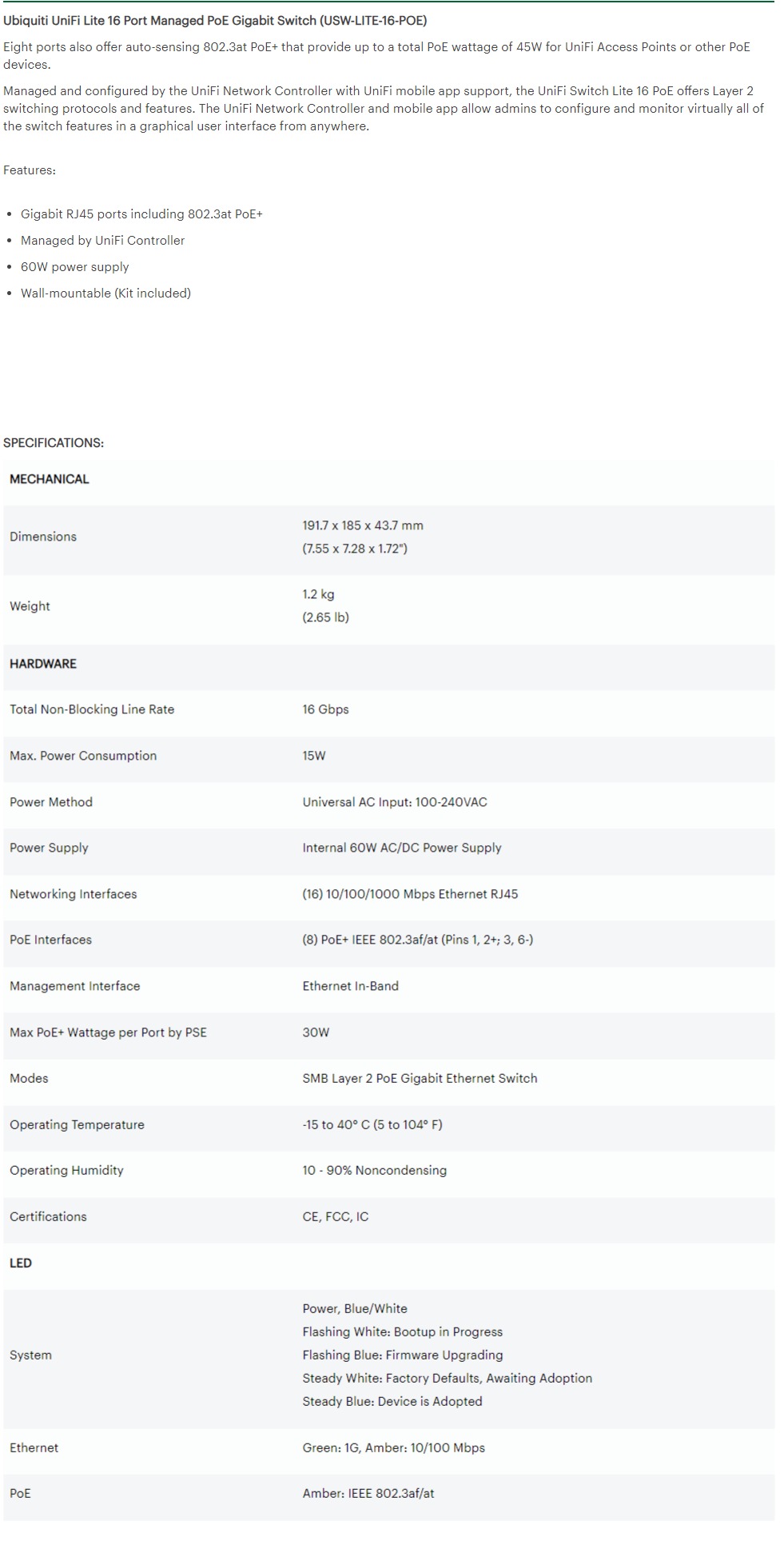 Sold Out - Check back or email us for updatesThe Ubiquiti Unifi Lite 16 is a fully managed switch with (16) GbE RJ45 ports, including 8 PoE+ ports, and a 45W total PoE supply for your UniFi access points and other PoE devices. The USW Lite 16 PoE also offers an extensive suite of Layer 2 switching protocols, and can be monitored or configured from anywhere with the powerful, intuitive UniFi Network web application and mobile app.