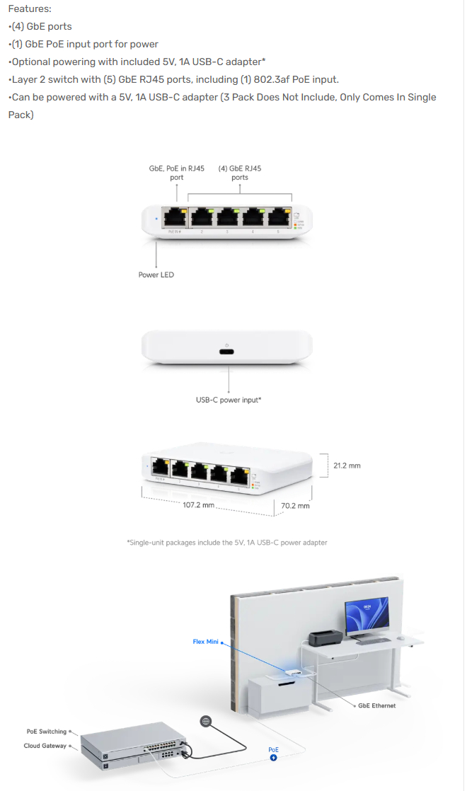 The Ubiquiti UniFi Switch Flex Mini 5-Port Gigabit Switch (USW-FLEX-MINI-AU) is a fully managed switch with 5x GbE RJ45 ports, including 1x PoE input. Configurable and can be monitored using the UniFi Network app. Can be powered via PoE using port 1, or using the included Type-C power adapter. The UniFi Switch Flex Mini offers the forwarding capacity to simultaneously process traffic on all ports at line rate without any packet loss.