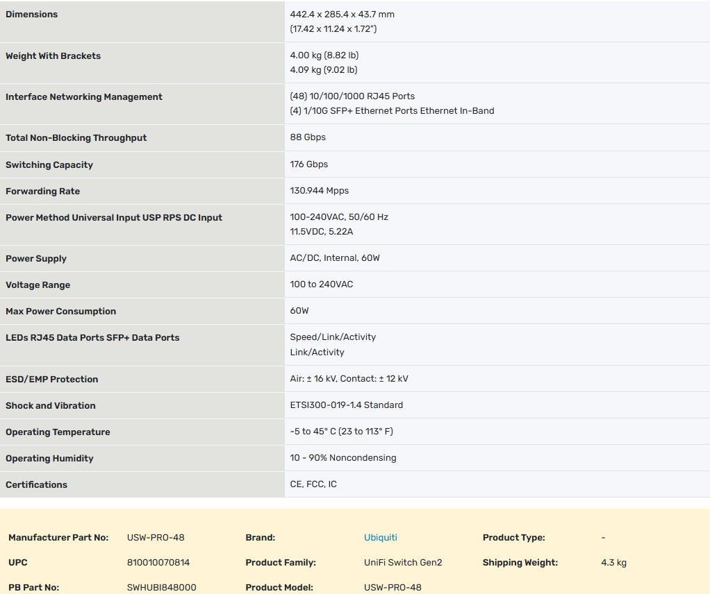 UniFi Switch Pro 48 is a fully managed Layer 3 switch with (48) Gigabit Ethernet ports. (4) 10G SFP+ uplinks offer link aggregation for higher capacity and increased availability. The UniFi Switch Pro 48 features a rich set of Layer 2 capabilities and integrates Layer 3 functionality such as inter-VLAN routing, static routing, and DHCP server. The UniFi Switch Pro 48 is an ideal aggregation and access layer switch for any UniFi solution – it combines innovative near-silent cooling with UniFi SmartPower RPS power redundancy. UniFi Network Controller and UniFi Network mobile app allow admins to configure and monitor virtually all of the switch features in an intuitive graphical user interface from anywhere. Features: (48) Gigabit RJ45 ports (4) 10G SFP+ ports Layer 2 and Layer 3* features UniFi SmartPower RPS DC input Near-silent cooling 1.3" touchscreen display Managed by UniFi Network Controller<p>