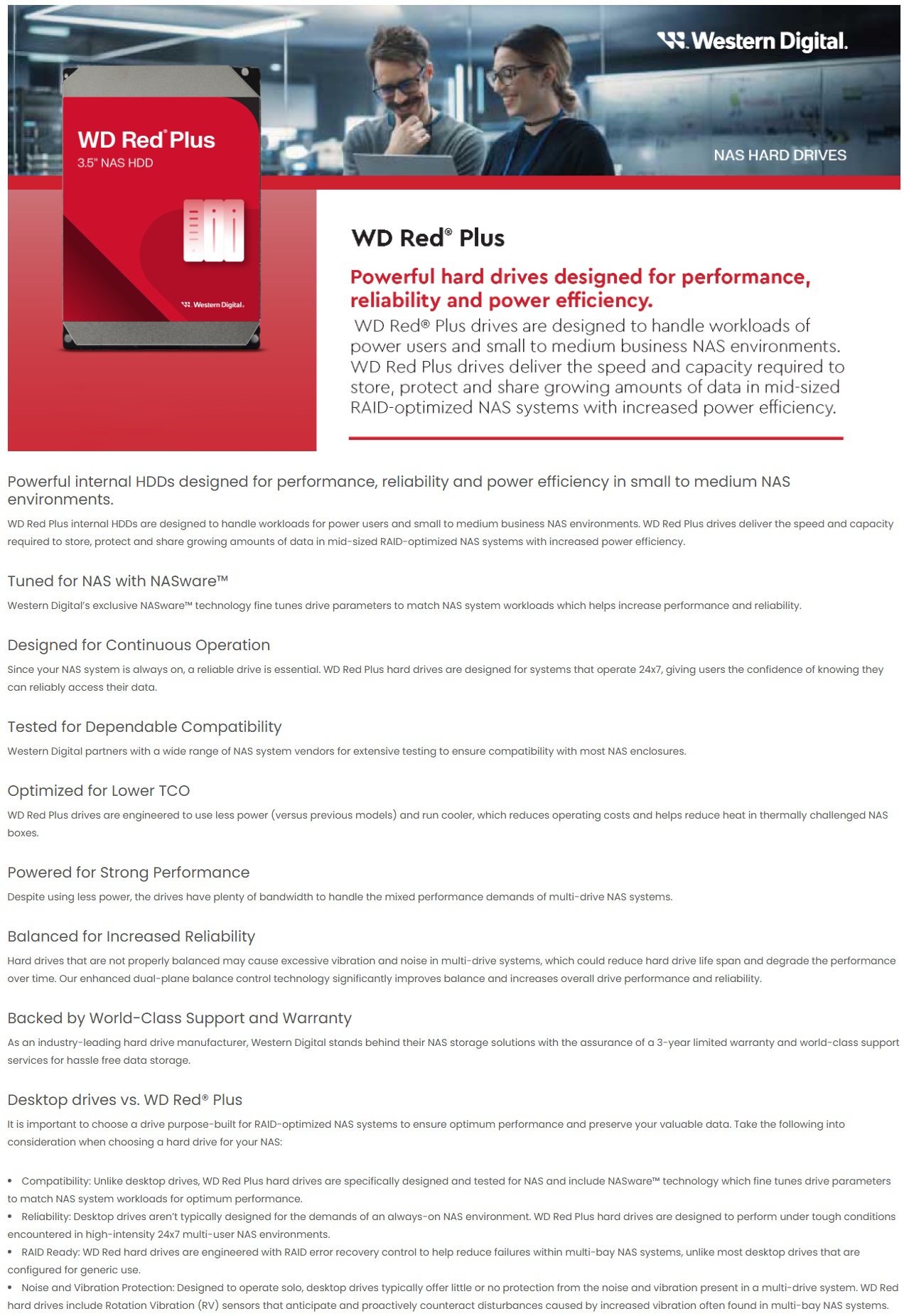 The WD Red Plus 10TB NAS drive is engineered for NASware™ optimization, 24×7 reliability, and smooth RAID performance in up to eight‑bay systems. It runs cool and efficiently while delivering up to 260 MB/s transfers, a 512 MB cache, dual‑plane balance control, and the assurance of a 3‑year warranty.