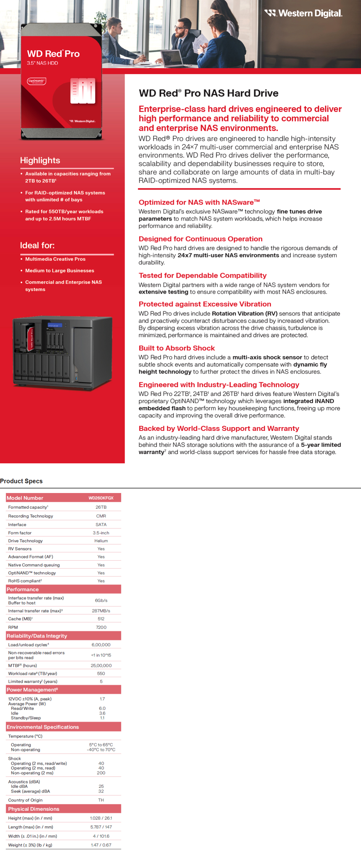 Western Digital WD Red Pro 26TB 3.5" NAS HDD SATA3 7200RPM 512MB Cache 24x7 ~24-bays NASware 3.0 CMR Tech with a 5 year WD warranty. Designed specifically with medium or large scale business customers in mind, WD Red™ Pro drives are available for up to 24-bay NAS systems.