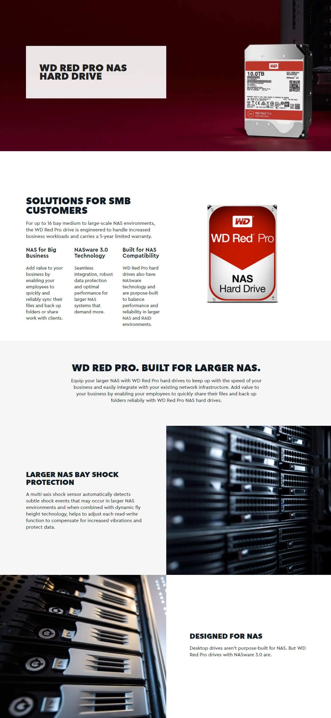 Designed specifically with medium or large scale business customers in mind, WD Red™ Pro drives are available for up to 24-bay NAS systems. Engineered to handle high-intensity workloads1 in 24x7 environments, WD Red™ Pro is ideal for archiving and sharing, as well as RAID array rebuilding on extended operating systems such as ZFS or other file systems. These drives add value to your business by enabling your employees to quickly share their files and back-up folders reliably in your NAS solution.