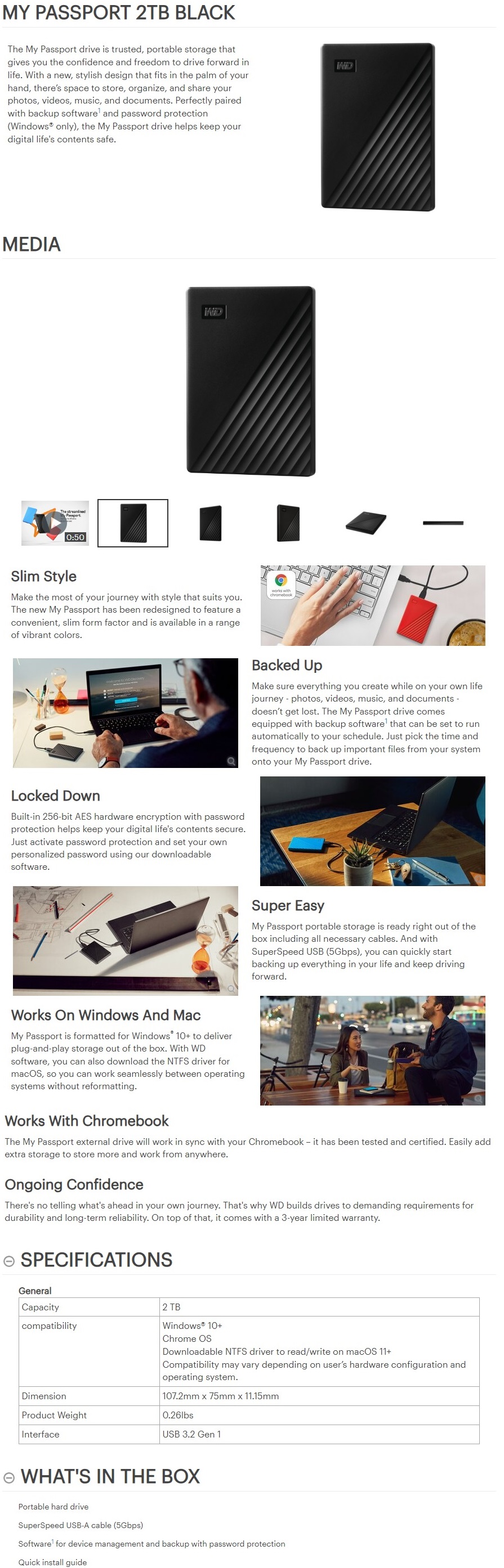 The My Passport drive is trusted, portable storage that gives you the confidence and freedom to drive forward in life. With a new, stylish design that fits in the palm of your hand, there’s space to store, organize, and share your photos, videos, music, and documents. Perfectly paired with backup software1 and password protection (Windows® only), the My Passport drive helps keep your digital life's contents safe.