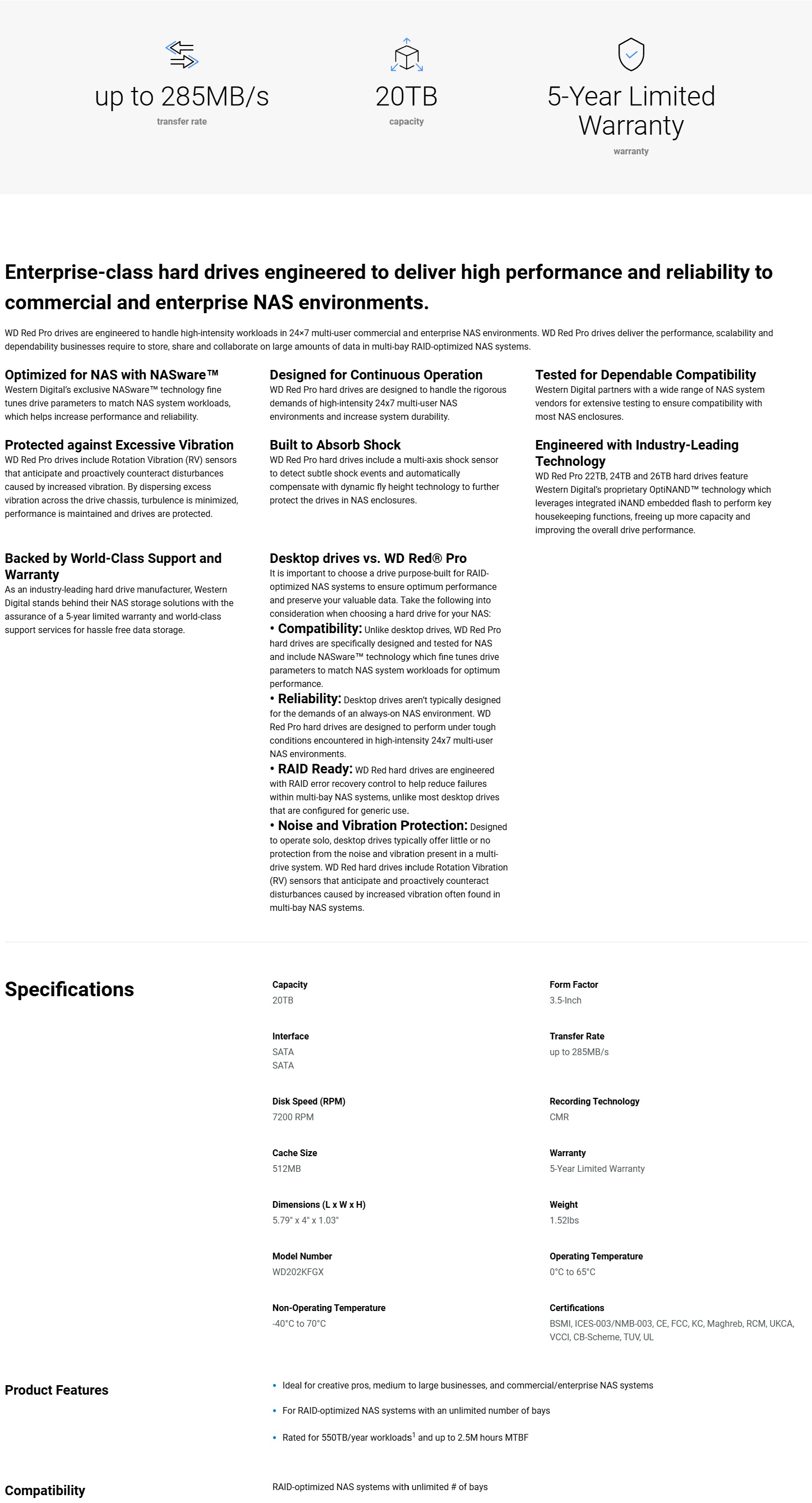 The WD Red Pro 20TB 3.5" NAS HDD is built for 24/7 multi‑user, RAID‑optimized NAS environments, delivering enterprise‑class performance and reliability. It features NASware tuning, RV and multi‑axis shock sensors, and dynamic fly height technology for consistent operation. With a SATA 6 Gb/s interface and a 5‑year limited warranty, it’s a robust choice for high‑capacity NAS systems.