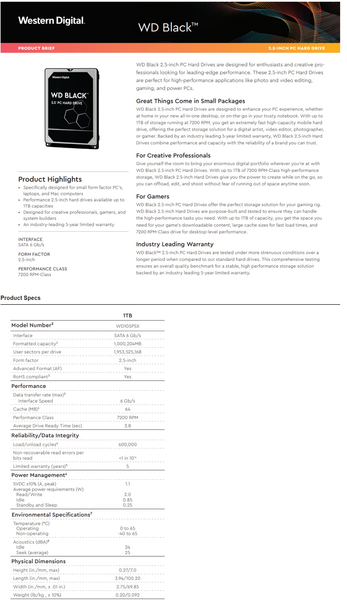 Sold Out - Check back or email us for updatesThe Western Digital WD Black WD10SPSX 2.5in 1TB HDD is designed to enhance your PC experience, whether at home in your new all-in-one desktop, or on-the-go in your trusty notebook. With up to 1TB of storage running at 7200 RPM with 64MB Cache, you get an extremely fast high-capacity mobile hard drive, offering the perfect storage solution for a digital artist, video editor, photographer, or gamer.