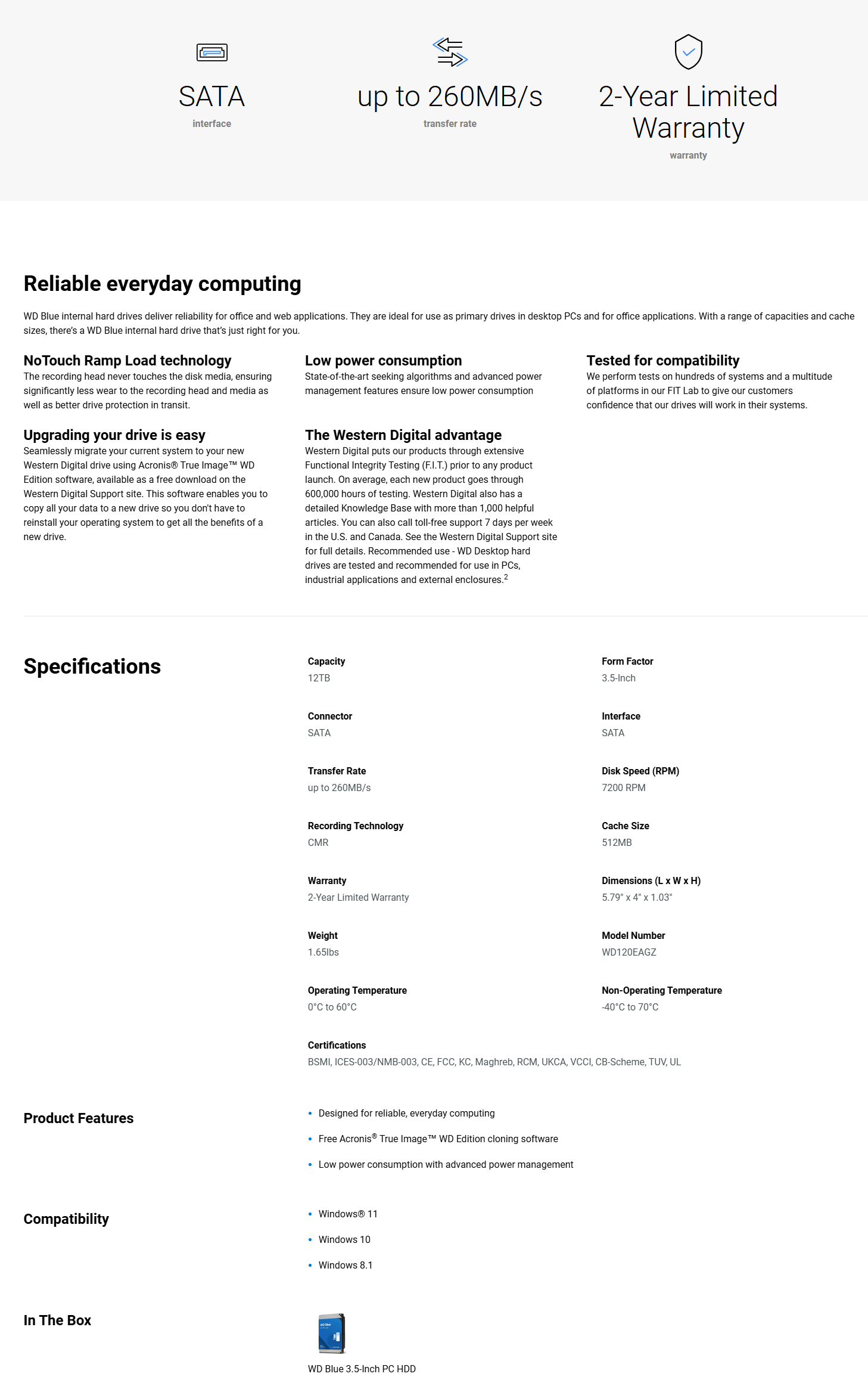 The WD120EAGZ is a 12TB WD Blue 3.5-inch SATA desktop hard drive designed for everyday PC use, offering high capacity, solid reliability, and low power consumption. It features a 7200RPM spindle, 512MB cache, CMR recording, and up to 260MB/s transfer rate, making it suitable for desktop storage, external enclosures, and general-purpose workloads
