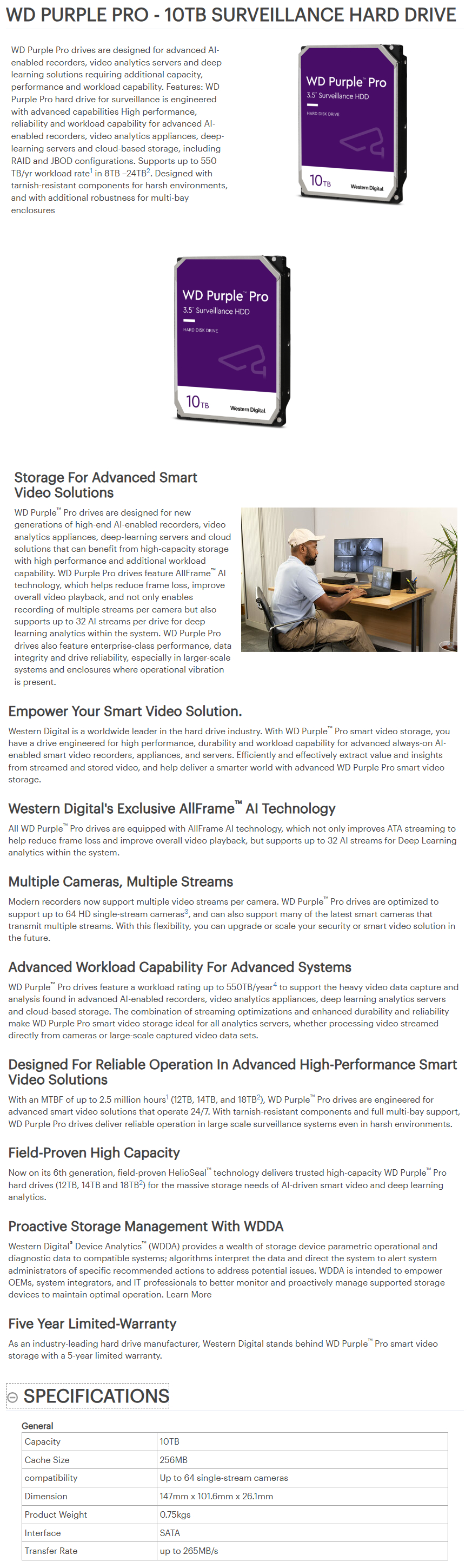 Sold Out - Check back or email us for updatesWestern Digital WD 10TB Purple Pro Surveillance 3.5" Hard Drive, SATA3, 7200RPM, 256MB Cache, 64x Camera Support, 32 AI Streams, 2Mh MTBF, 550TB/yr Workload, CMR with a 3 year WD warranty.