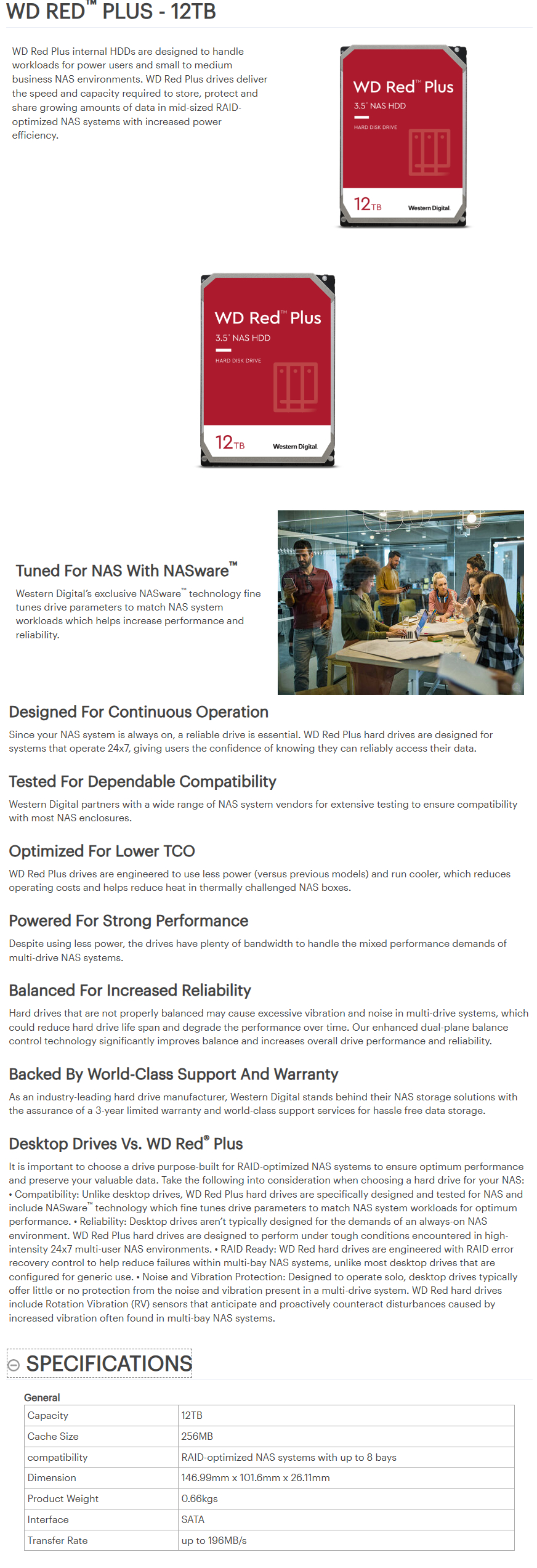 The Western Digital WD Red Plus 12TB WD120EFBX 3.5in Hard Drive with 256MB Cache , CMR is packed with power to handle small to medium-sized business NAS environments and increase workloads for SOHO customers. It features transfer speeds of up to 196MB/s, NASware 3.0 technology, enhanced dual-plane balance control technology, and a capacity of 12TB.