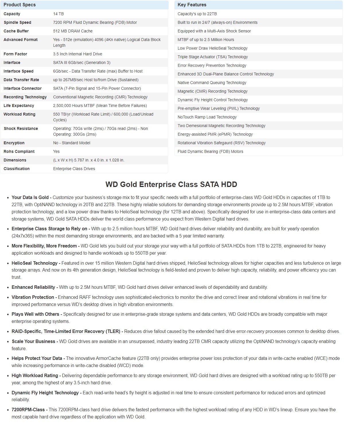 The WD WD141KRYZ 14TB Gold 3.5" SATA 6Gb/s 512e Enterprise Hard Drive - Form Factor: 3.5" - Interface: SATA 6Gb/s - 512e - RoHS Compliant - Performance Class: 7200 RPM - Cache: 256MB - Data Transfer Rate: 267MB/s - MTBF: 2,500,000 Hours with a 5 Years Western Digital Warranty.